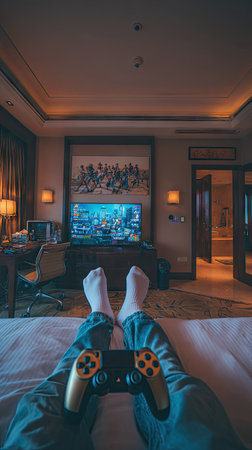 An overhead view shows a person holding a video game controller while relaxing. The scene captures the individual's legs and the controller with a television in the background. Warm lighting suggests an indoor setting. Potential uses include editorial content related to entertainment, leisure, and technology.