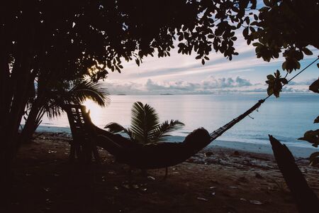 Woman reading a book relaxing in a hammock during sunset on a beach in Thailand
