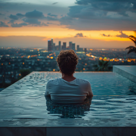 Rear view of young man sitting on edge of swimming pool and looking at city at sunset