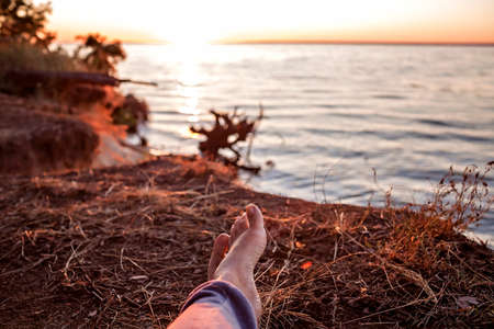 Happy man traveler lying on green lawn and relaxing at sunset time
