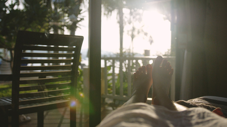 Bare feet in the bed in early morning in the sun with beautiful lens flare effect.