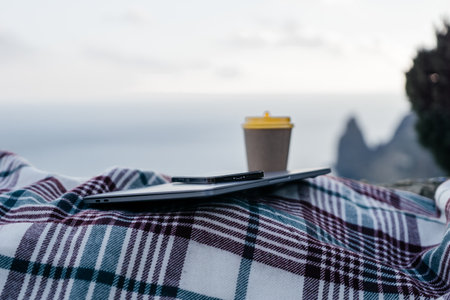 Laptop coffee on blanket with ocean view. Illustrating serene outdoor laptop use. Freelancer enjoying their time outdoors while working or browsing the internet.
