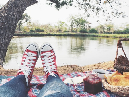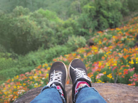Selfie hipster wearing black sneaker shoes over wild flower field background at viewpoint on mountain. Relaxation on vacation holidays concept.