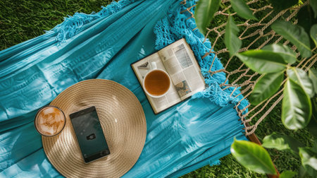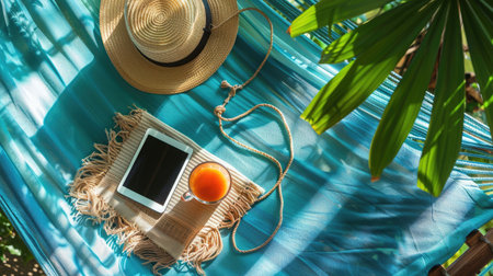 A hammock made from terrestrial plant fibers, under a tree on the beach, with a straw hat, a book, a cell phone, and a glass of orange juice AIG50