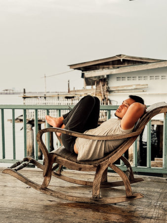 Asian ma relax on the rocking chair enjoy the sea view in Thailand.