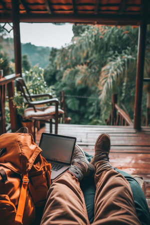 Close-up of a traveler's legs with a laptop on a wooden balcony, overlooking a lush jungle setting