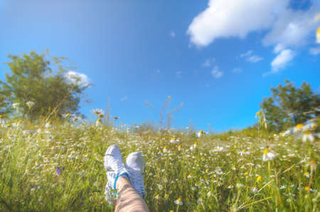 The feet of the traveler in sneakers on a Sunny meadow, first person view.