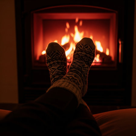 Cozy socks by the fireplace on a winter evening