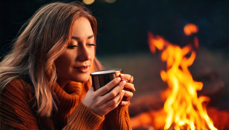 Young woman drinking hot tea near campfire at night. Girl in warm knitted sweater with cup of tea or coffee.