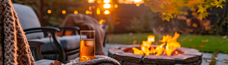 Cozy and inviting backyard patio setting in the autumn season featuring a crackling firepit warm blankets drinks