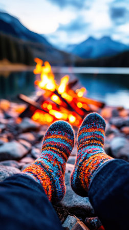 Experience the essence of cozy living as you relax by the fireplace with warm socks and a comforting drink in a rustic cabin. Enjoy the serene atmosphere.
