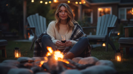 Young woman enjoying a glass of wine by a bonfire in her backyard, creating a warm and inviting autumn evening atmosphere