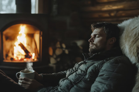 Warm beverage next to roaring fire, man resting indoors with cup in hand concept of comfort, winter, and peaceful lifestyle.