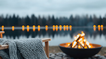 The image captures a cozy, serene outdoor space featuring a fire pit, a soft blanket, and a calm lake. It conveys warmth and relaxation, creating an intimate atmosphere.