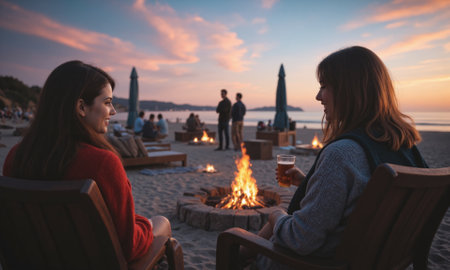 Friends relaxing on the beach at dusk, warming their feet by a cozy bonfire, enjoying the warmth of flames and the glow of twilight