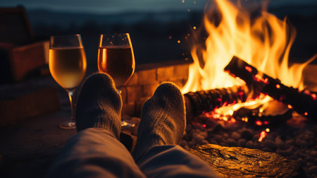 Cold fall or winter evening. People resting by the fire with blanket and tea. Closeup photo of feet in woolen socks. Cozy scene. Generative AI
