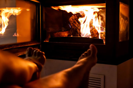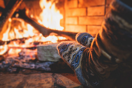 A serene moment captured with a woman's legs in socks, placed comfortably in front of a beautifully crackling fireplace.