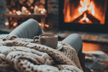 Person bundled up in a large knitted wool blanket, sitting by a roaring fireplace, with a steaming mug of cocoa and soft lighting creating a cozy vibe