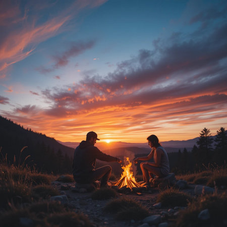 A group of friends enjoys a peaceful evening around a fire, engaging in conversation as the sun sets. A.I.