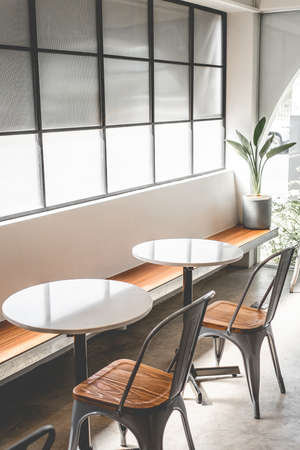Interior of cafe restaurant slective focus table and chairs.
