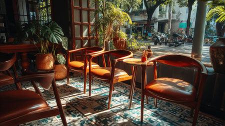 A charming cafe interior featuring wooden chairs bathed in warm sunlight, surrounded by vibrant plants, creating an inviting and tranquil atmosphere.