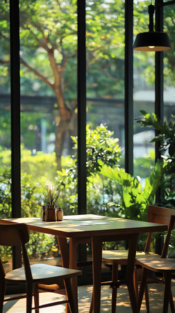 Interior view depicts wooden table set with condiments and cutlery, alongside chairs in cafe, featuring sunlit, verdant outdoor scenery through window.