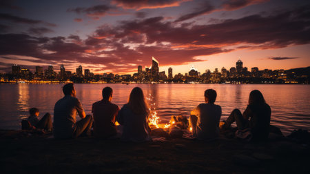 A group of friends sitting around a bonfire by the lake and enjoying the sunset.