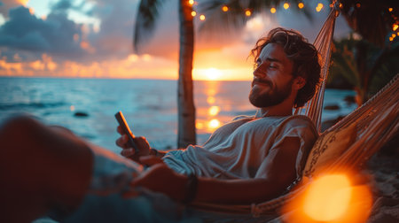 Serene scene as a young man enjoys the sunset while lying in a hammock with his smartphone, on a tropical beach.