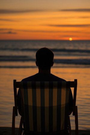 Man watches sunset over the sea from beach chair