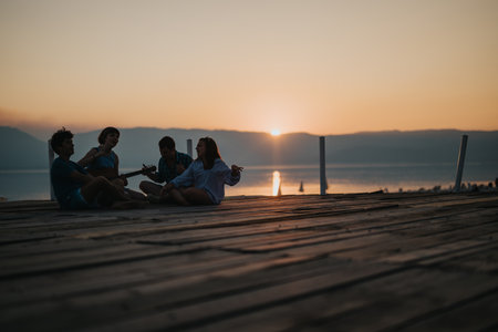 Friends enjoying a sunset on a wooden deck by the water