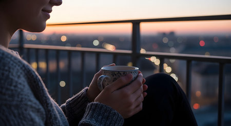 A woman enjoys a warm cup of coffee on a balcony overlooking a blurred city skyline at dusk. The soft lighting of the sunset and distant city lights creates a peaceful and contemplative mood. It represents relaxation, mindfulness, and enjoying a quiet moment at the end of the day.