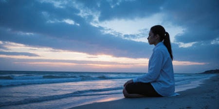 Person meditating at sunrise overlooking sea