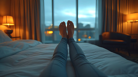 Woman legs on the edge of a swimming pool during sunset or sunrise