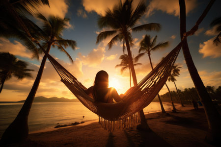 A beautiful young girl rest in a hammock on sand beach at sunset with palm tree. Summer tropical vacation concept. AI generated.