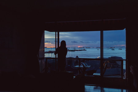 Twilight seascape with the sky and asian village from the windows of an apartment.