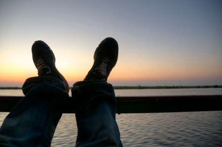 Man's feet and a beer cup with setting sun in the background
