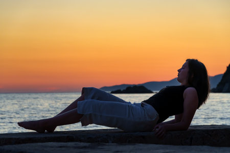 Silhouette of the young woman is lying on the deckchair at sunset.