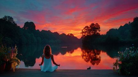 Lakeside Stillness - A woman meditating on a dock at sunrise, perfectly still water reflecting the pink sky, lone duck floating nearby
