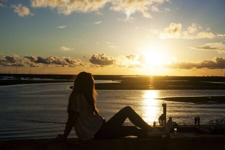 Girl watching sunset. Colorful Faro Portugal landscape. Sea shore sun going down. Lifestyle girl sitting background. Evening tranquil seascape.