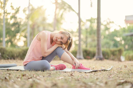 Young Asian woman healthy in sportswear sittng resting after exercise. Female relaxation in park outdoor.