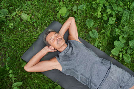Man laying on sport mat, relaxing in savasana pose after exercising at the fresh air