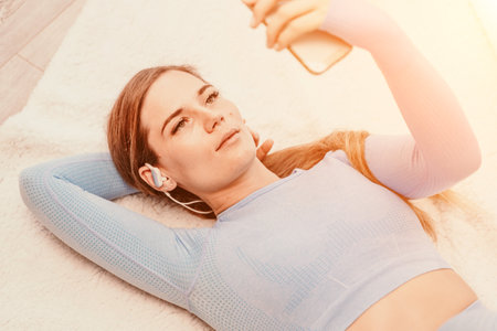 Portrait of fitness woman learning new exercises watching online workout tutorials on her phone at home. Young girl doing fitness in her apartment.