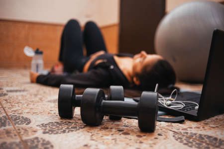 tired and drained athlete lays on floor. Overtraining syndrome. Washed-out feeling, tired, drained athletic man after doing fitness workout exercises.