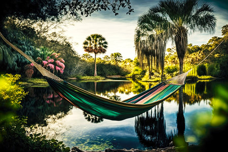 beautiful bright multicolored tropical hammock next to pond