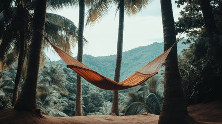 A serene view of a hammock suspended between two palm trees in a tropical paradise, inviting relaxation and peace in nature's embrace.