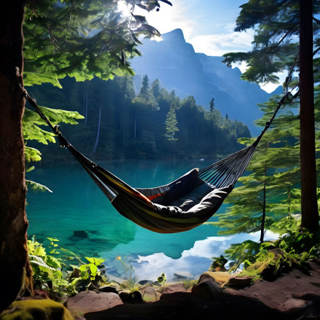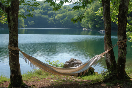 A hammock is suspended between two trees on the edge of a tranquil lake, offering a relaxing spot to unwind and enjoy the surrounding nature. The hammock gently sways in the breeze, inviting visitors to rest and take in the peaceful scenery.