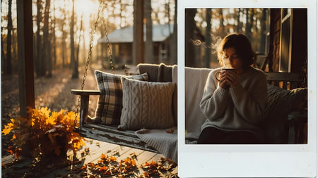 Young woman drinking coffee on a terrace in the autumn forest.