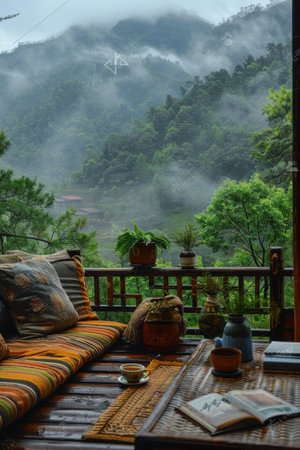 Rustic wooden terrace featuring a hammock swaying gently, overlooking scenic hills covered with dense green forest under bright morning sunlight