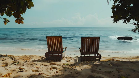 Two wooden chairs on the beach with the sea in the background, Generative AI illustrations.