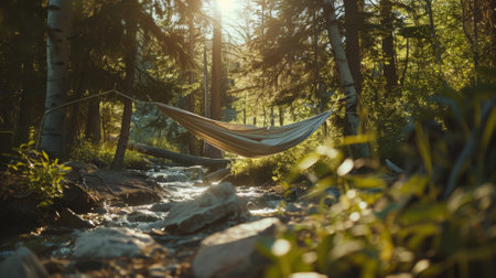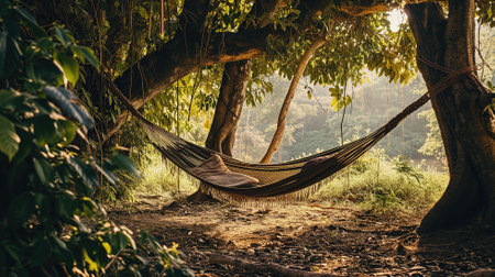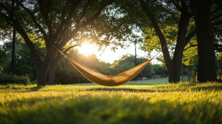 As the golden hour casts its warm hues, a hammock tied between trees offers a perfect spot for relaxation, surrounded by nature's serenity